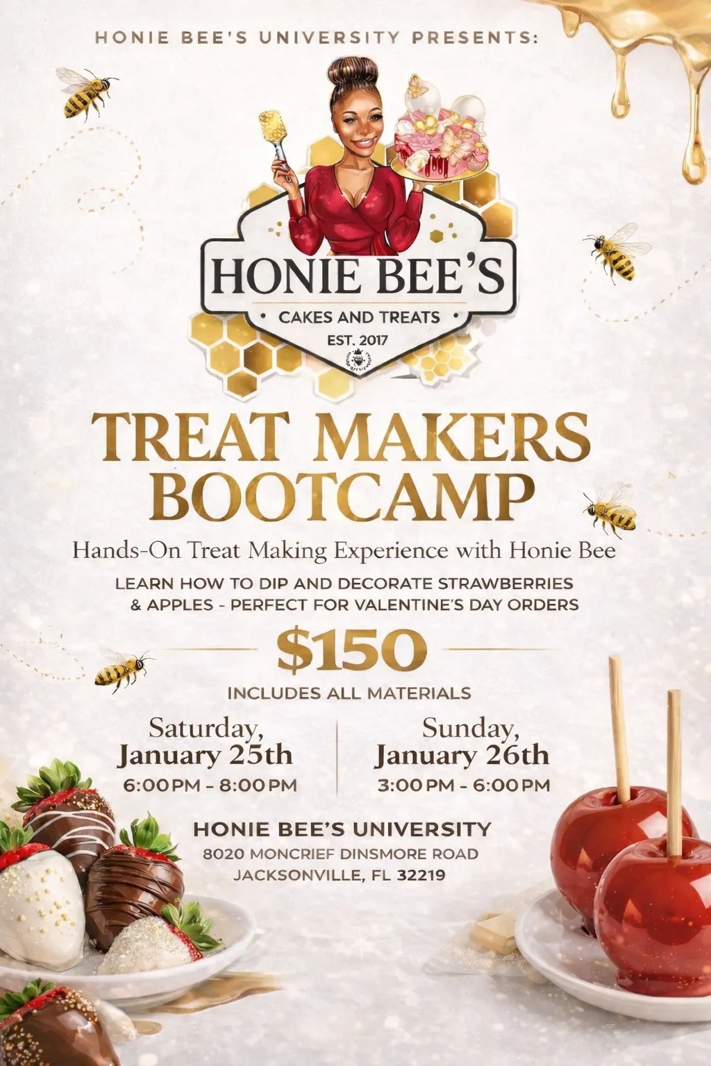 Classes provide access to tools, aprons, gloves, molds, stencils, cutters, piping bags, how-to guides, and guidance from Honie Bee.